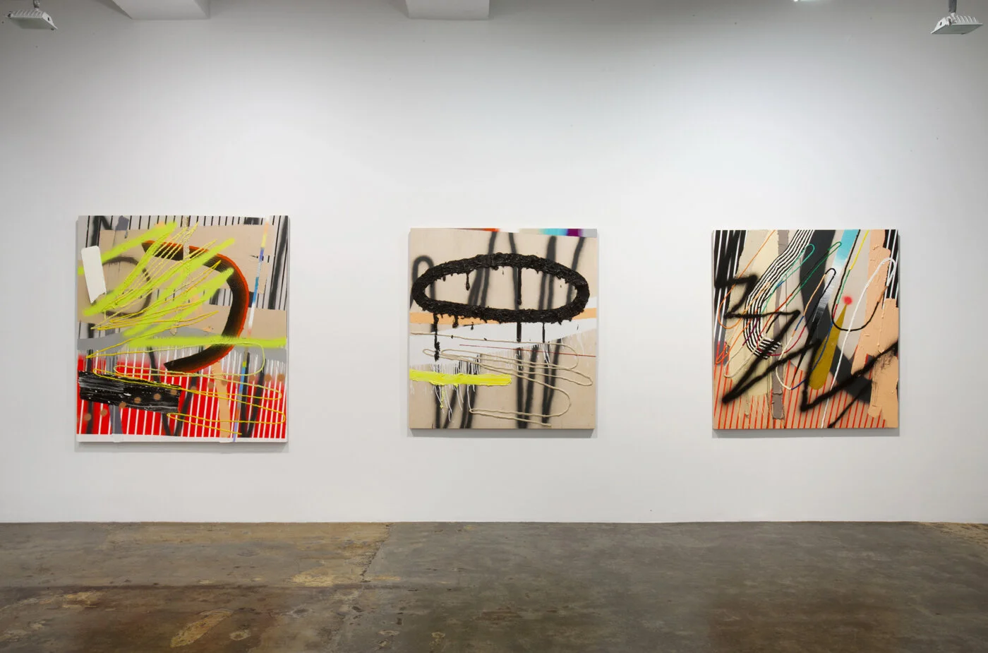 Benson’s color palette is decadent. Pure unadulterated color, lustily saturated, is often squeezed from the tube directly onto the canvas. Non-traditional tools such as brooms, squeegees, and even hair picks are used to slather, drag and manipulate the thick paint. There is an element of chance as thick paint pulled by its own weight breaks and tumbles leaving a trail of marks. Areas of raw canvas or panel are left exposed to break the illusion and thick globs of paint protrude from the picture plane reminding the viewer that this is a painting in-and-of-itself.